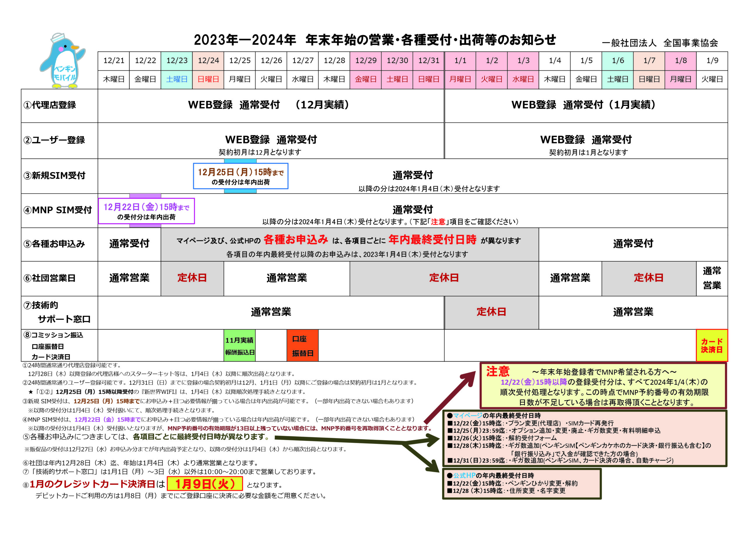 年末年始にかかる営業・各種受付・出荷などにつきましては、下記スケジュールのようになります。