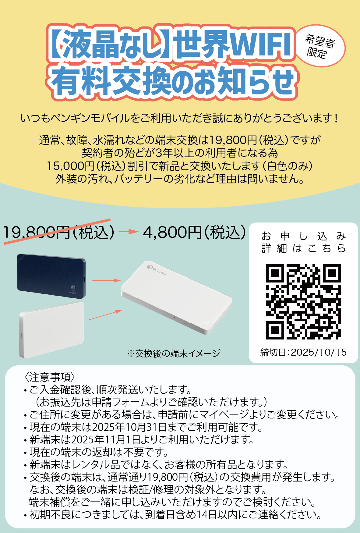 通常19,800円(税込)で承っている端末交換を、期間限定の特別価格4,800円(税込)にてご案内させていただきます。